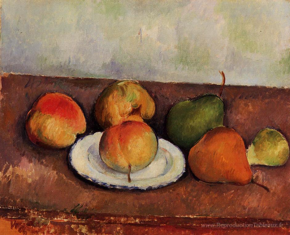 Nous vous proposons une reproduction artisanale sur toile du célèbre tableau 'Assiette de vie morte et fruits' de Paul Cezanne, provenant du Musée de la Reproduction.