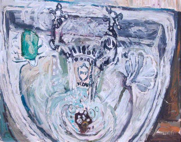 Nous vous proposons une reproduction artisanale sur toile du célèbre tableau 'Bassin avec savon vert' de John Bratby, provenant du Musée de la Reproduction.