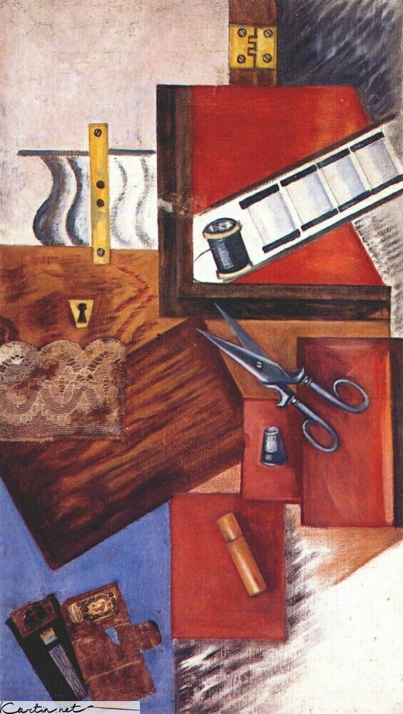 Nous vous proposons une reproduction artisanale sur toile du célèbre tableau 'Boîte de travail' de Olga Rozanova, provenant du Musée de la Reproduction.