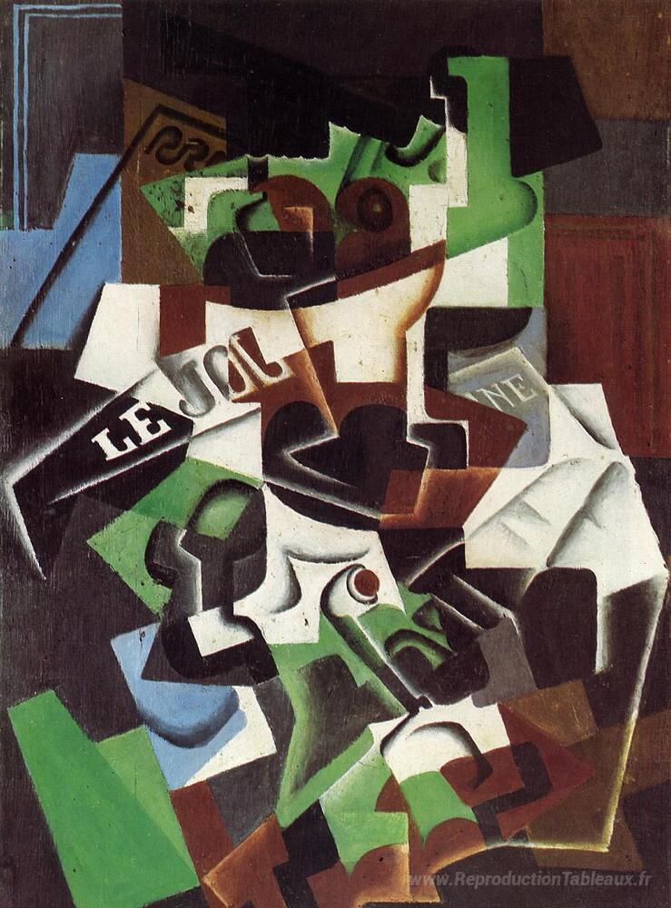 Nous vous proposons une reproduction artisanale sur toile du célèbre tableau 'Bol à fruits, pipe et journal' de Juan Gris, provenant du Musée de la Reproduction.