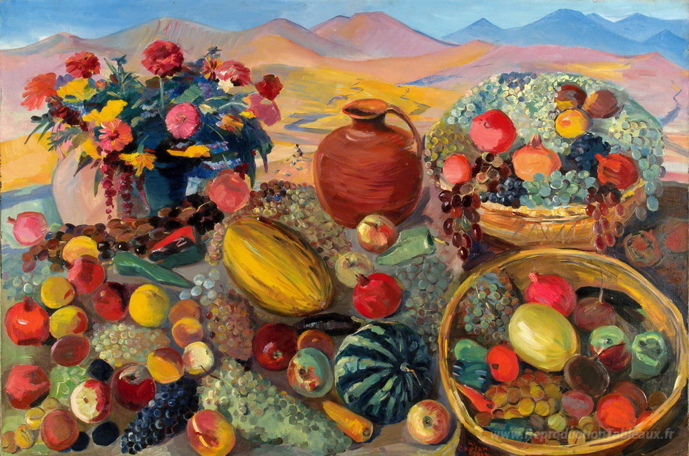 Nous vous proposons une reproduction artisanale sur toile du célèbre tableau 'Cadeaux d'automne' de Martiros Saryan, provenant du Musée de la Reproduction.