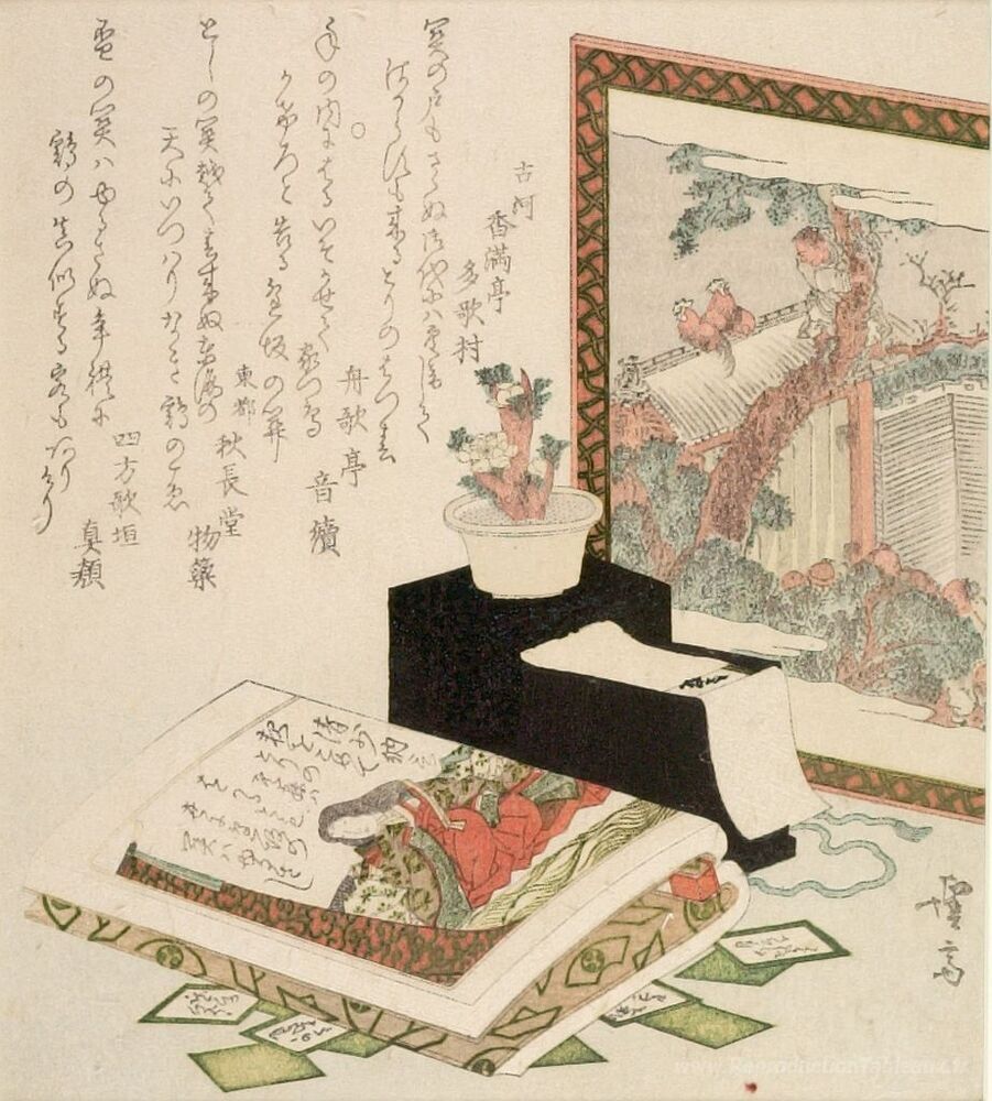 Nous vous proposons une reproduction artisanale sur toile du célèbre tableau 'Cartes, fleurs et écran Fukujuuso' de Keisai Eisen, provenant du Musée de la Reproduction.