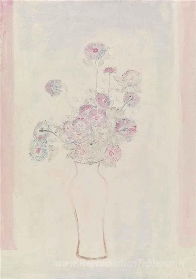 Nous vous proposons une reproduction artisanale sur toile du célèbre tableau 'Chrysanthèmes roses dans un vase blanc' de Sanyu, provenant du Musée de la Reproduction.