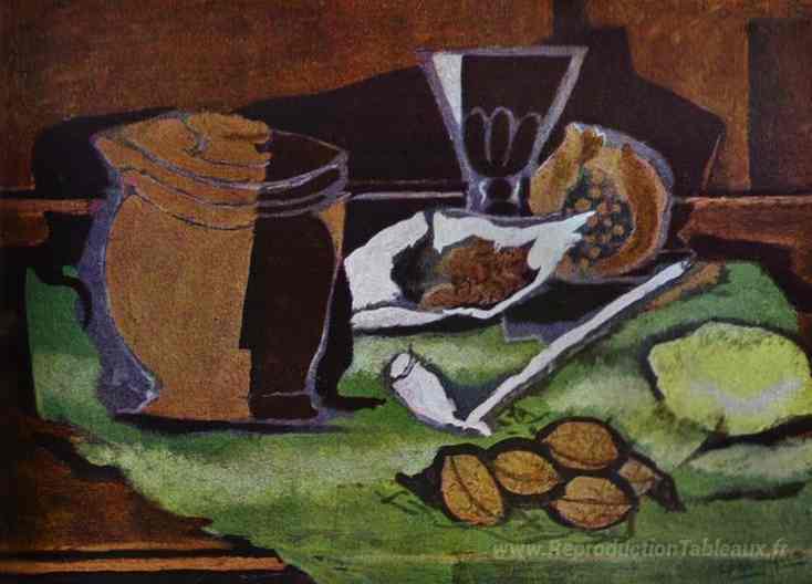 Nous vous proposons une reproduction artisanale sur toile du célèbre tableau 'Citron, noix et pot avec du tabac' de Georges Braque, provenant du Musée de la Reproduction.