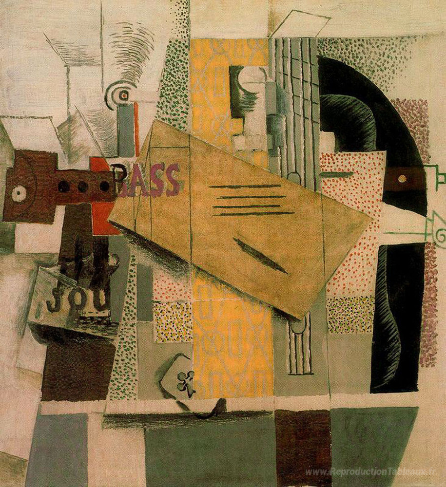 Nous vous proposons une reproduction artisanale sur toile du célèbre tableau 'Clarinette, bouteille de basse, journal, as de clubs' de Pablo Picasso, provenant du Musée de la Reproduction.