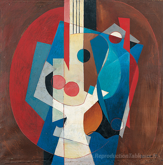 Nous vous proposons une reproduction artisanale sur toile du célèbre tableau 'Composition avec guitare' de Leo Leuppi, provenant du Musée de la Reproduction.