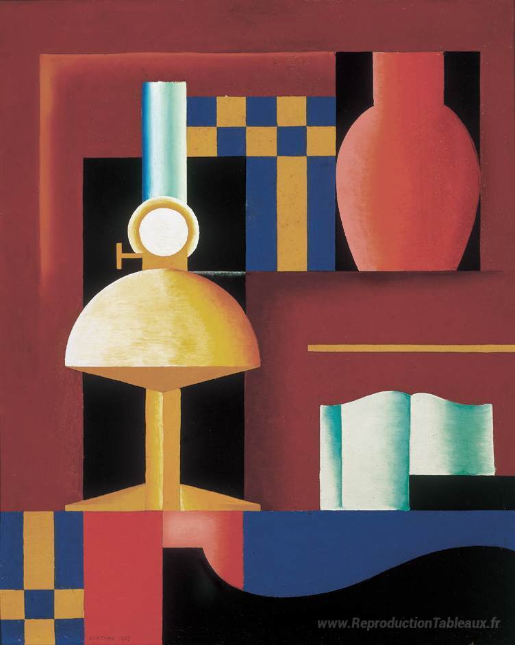 Nous vous proposons une reproduction artisanale sur toile du célèbre tableau 'Composition avec lampe paraffine, vase et livre' de Sandor Bortnyik, provenant du Musée de la Reproduction.