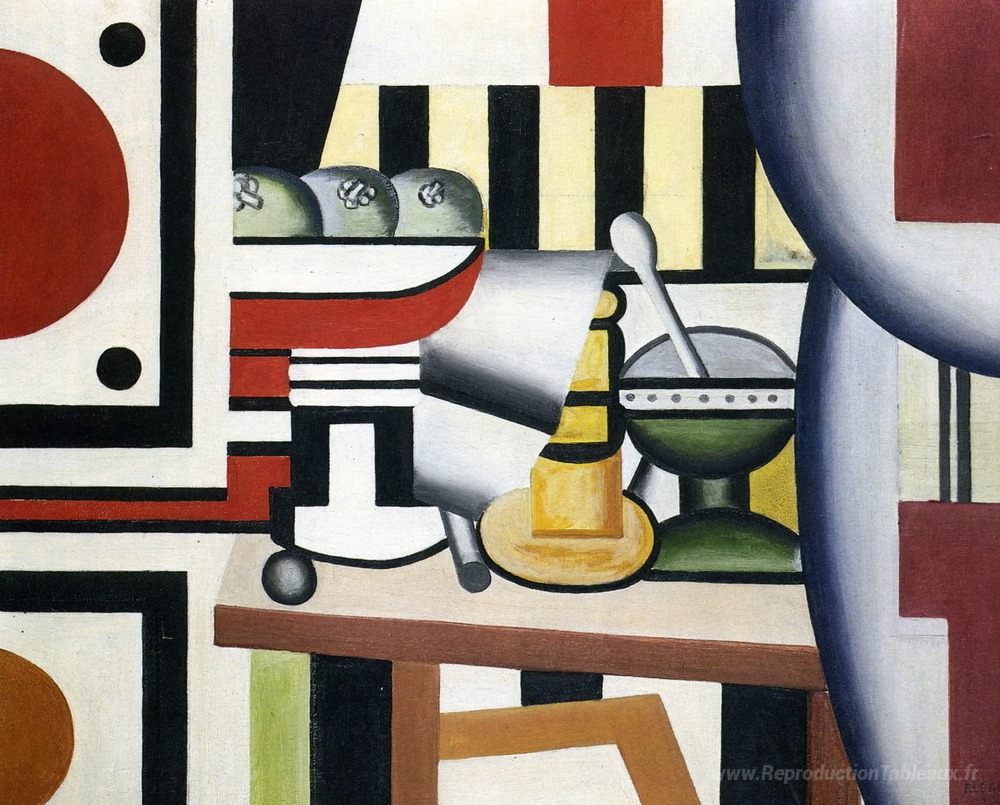 Nous vous proposons une reproduction artisanale sur toile du célèbre tableau 'Compotoir de poire' de Fernand Leger, provenant du Musée de la Reproduction.