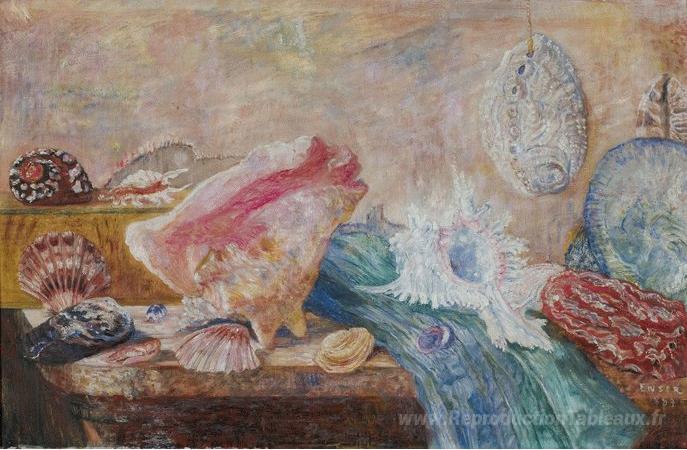 Nous vous proposons une reproduction artisanale sur toile du célèbre tableau 'Coquilles et crustacés' de James Ensor, provenant du Musée de la Reproduction.