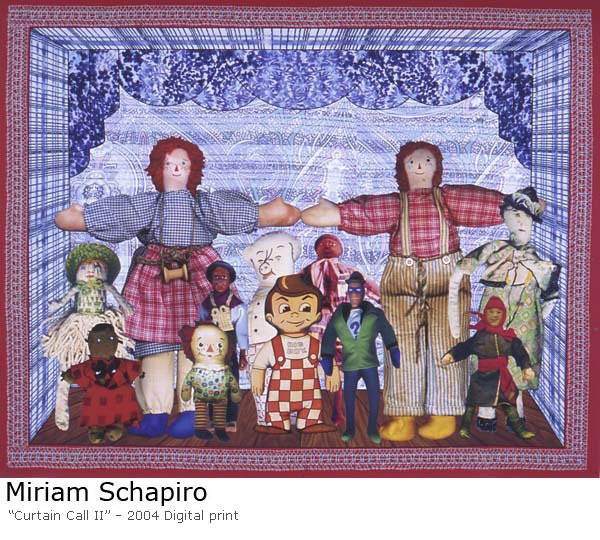 Nous vous proposons une reproduction artisanale sur toile du célèbre tableau 'Curtain Call II' de Miriam Schapiro, provenant du Musée de la Reproduction.