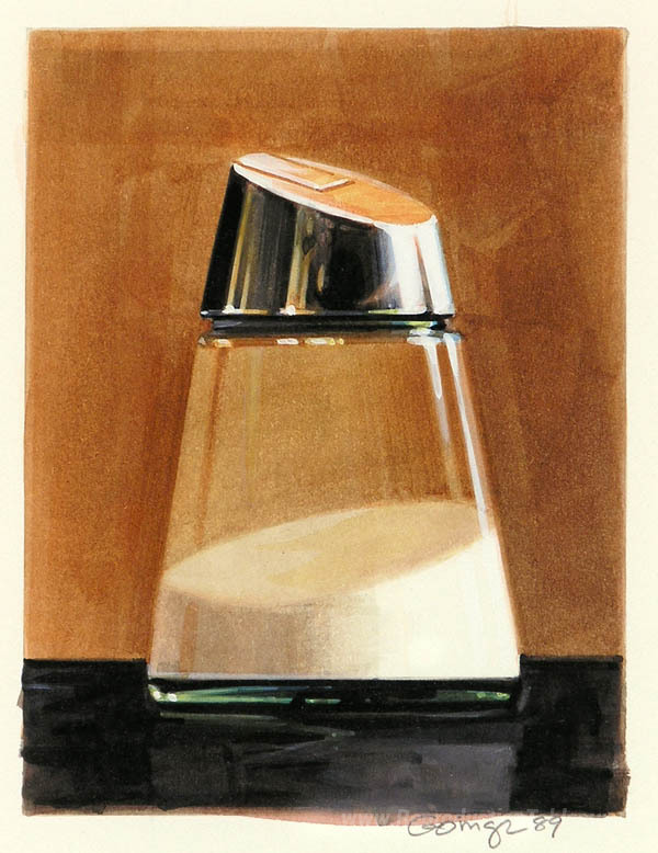 Nous vous proposons une reproduction artisanale sur toile du célèbre tableau 'Distributeur de sucre 1989' de Ralph Goings, provenant du Musée de la Reproduction.