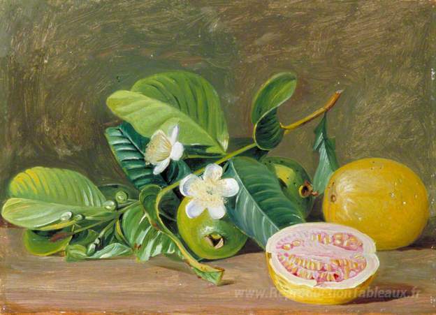 Nous vous proposons une reproduction artisanale sur toile du célèbre tableau 'Feuillage, fleurs et fruits d'une variété de goyave' de Marianne North, provenant du Musée de la Reproduction.