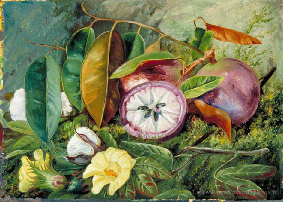 Nous vous proposons une reproduction artisanale sur toile du célèbre tableau 'Feuillage, fleurs et vaisseaux de graines de coton et fruits de ' de Marianne North, provenant du Musée de la Reproduction.
