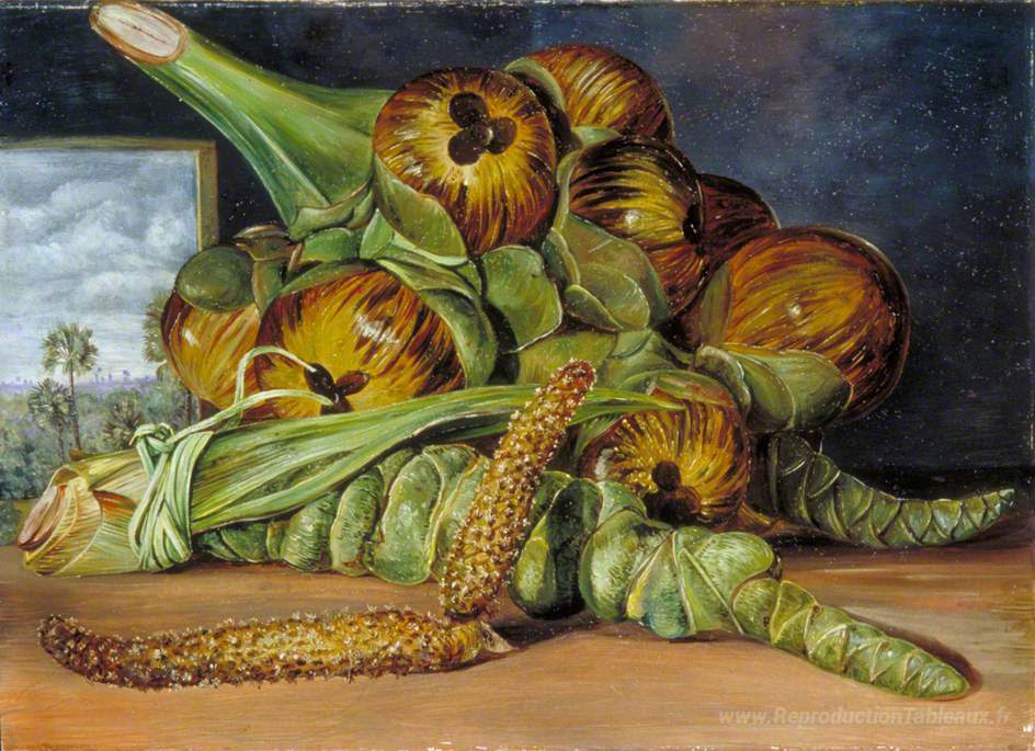 Nous vous proposons une reproduction artisanale sur toile du célèbre tableau 'Fleurs et fruits de la Palmyre, et la paume vue à travers une fe' de Marianne North, provenant du Musée de la Reproduction.