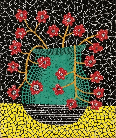 Nous vous proposons une reproduction artisanale sur toile du célèbre tableau 'Fleurs' de Yayoi Kusama, provenant du Musée de la Reproduction.
