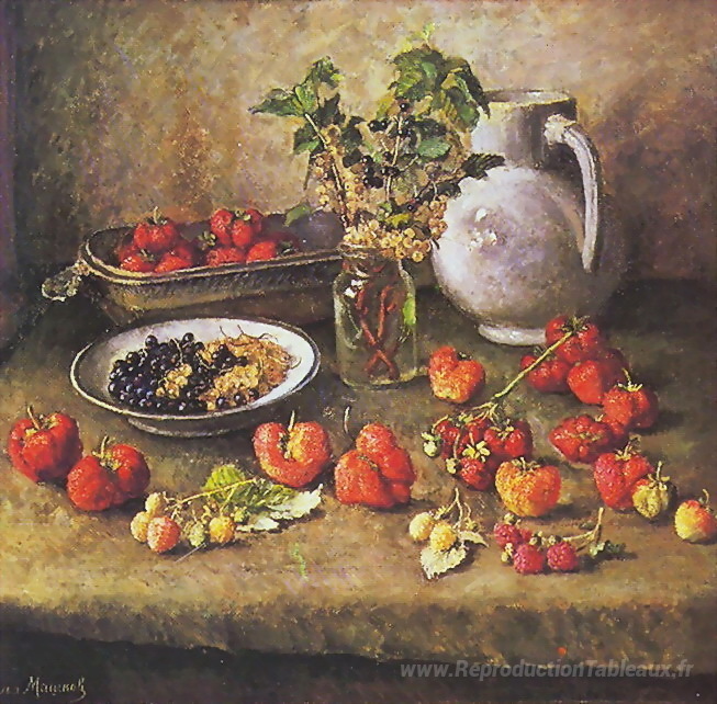 Nous vous proposons une reproduction artisanale sur toile du célèbre tableau 'Fraise et pot blanc' de Ilya Mashkov, provenant du Musée de la Reproduction.