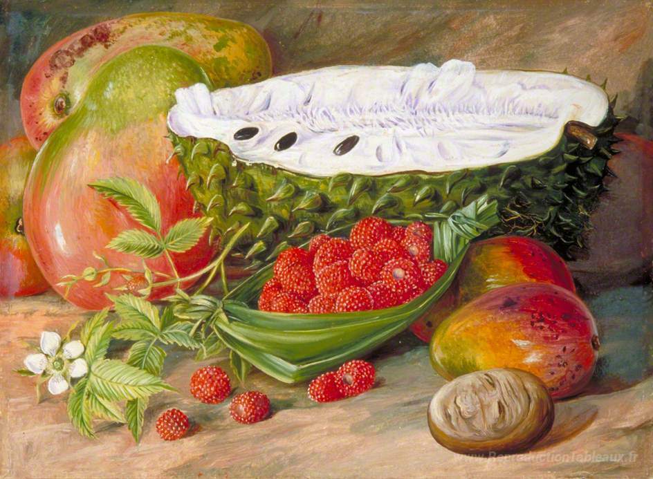 Nous vous proposons une reproduction artisanale sur toile du célèbre tableau 'Fruits cultivés dans les Seychelles' de Marianne North, provenant du Musée de la Reproduction.
