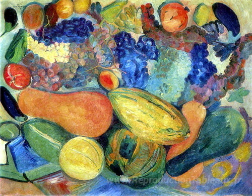 Nous vous proposons une reproduction artisanale sur toile du célèbre tableau 'Fruits et légumes' de Martiros Saryan, provenant du Musée de la Reproduction.