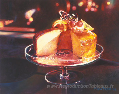 Nous vous proposons une reproduction artisanale sur toile du célèbre tableau 'Gâteau de pavot: vitré pour calypso' de Mary Pratt, provenant du Musée de la Reproduction.