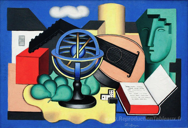 Nous vous proposons une reproduction artisanale sur toile du célèbre tableau 'Globe et banjo' de Jean Metzinger, provenant du Musée de la Reproduction.