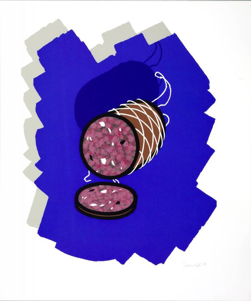 Nous vous proposons une reproduction artisanale sur toile du célèbre tableau 'Grosse saucisse' de Patrick Caulfield, provenant du Musée de la Reproduction.