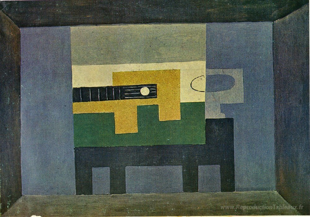 Nous vous proposons une reproduction artisanale sur toile du célèbre tableau 'Guitare et cruche sur une table' de Pablo Picasso, provenant du Musée de la Reproduction.