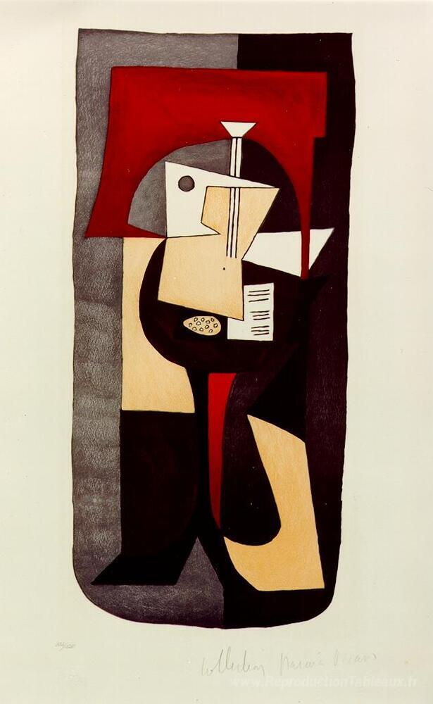 Nous vous proposons une reproduction artisanale sur toile du célèbre tableau 'Guitare sur piédestal' de Pablo Picasso, provenant du Musée de la Reproduction.
