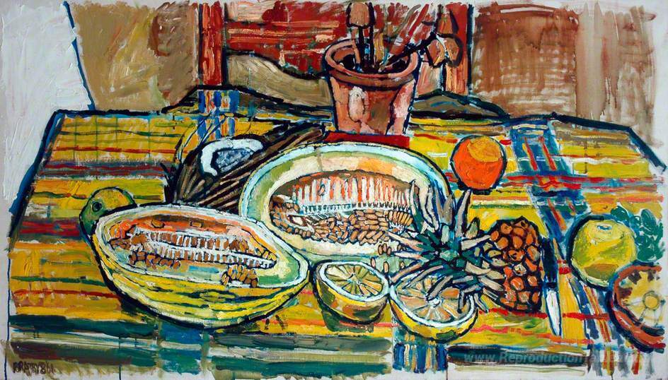 Nous vous proposons une reproduction artisanale sur toile du célèbre tableau 'Juif mâcher miellat' de John Bratby, provenant du Musée de la Reproduction.