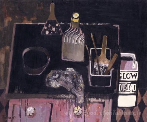 Nous vous proposons une reproduction artisanale sur toile du célèbre tableau 'La table de gravure' de Mary Fedden, provenant du Musée de la Reproduction.