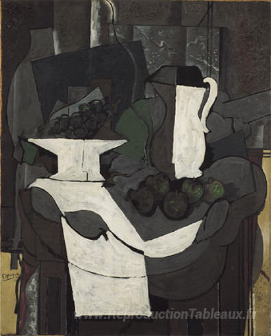 Nous vous proposons une reproduction artisanale sur toile du célèbre tableau 'Le bol de raisins' de Georges Braque, provenant du Musée de la Reproduction.