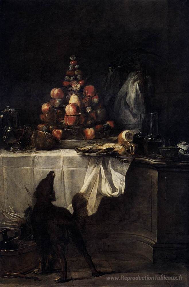 Nous vous proposons une reproduction artisanale sur toile du célèbre tableau 'Le buffet' de Jean-Baptiste-Simeon Chardin, provenant du Musée de la Reproduction.