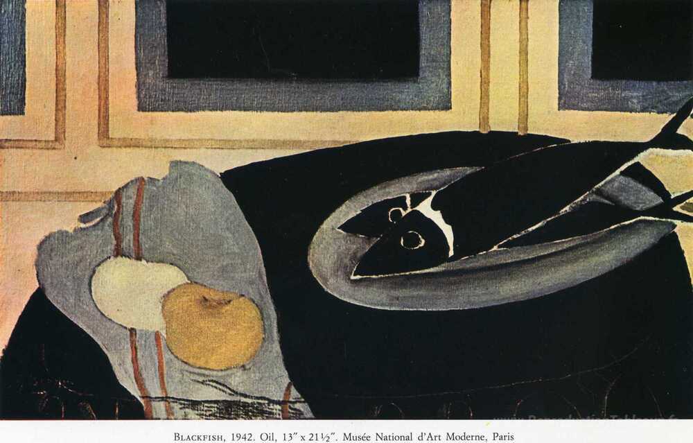Nous vous proposons une reproduction artisanale sur toile du célèbre tableau 'Le poisson noir' de Georges Braque, provenant du Musée de la Reproduction.