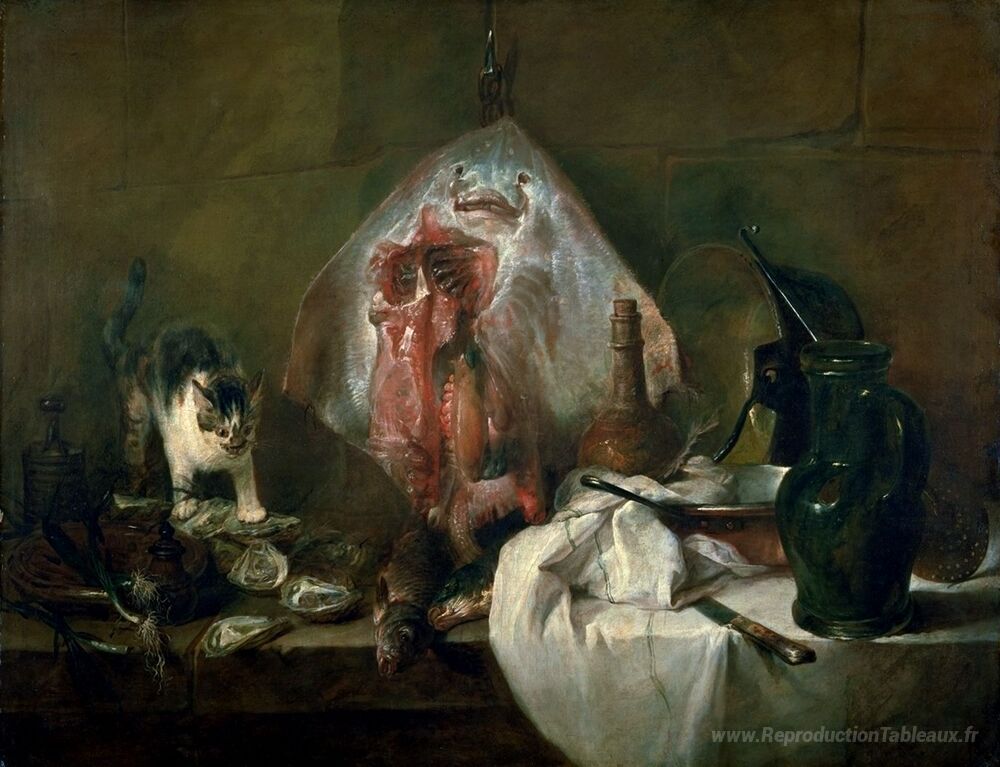 Nous vous proposons une reproduction artisanale sur toile du célèbre tableau 'Le rayon ou, l'intérieur de la cuisine' de Jean-Baptiste-Simeon Chardin, provenant du Musée de la Reproduction.