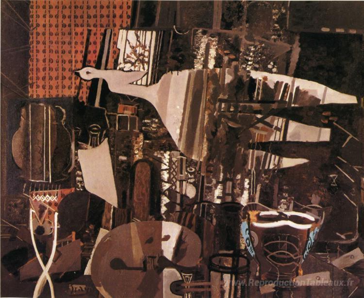 Nous vous proposons une reproduction artisanale sur toile du célèbre tableau 'Le studio (v)' de Georges Braque, provenant du Musée de la Reproduction.