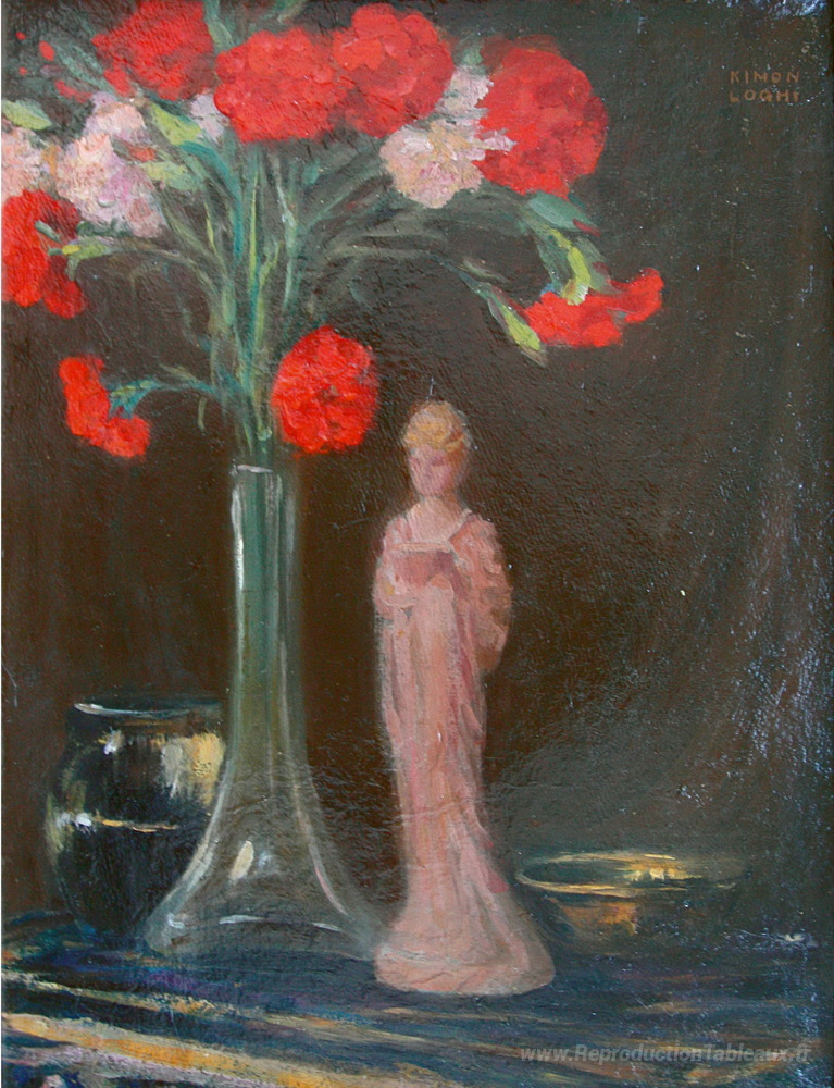 Nous vous proposons une reproduction artisanale sur toile du célèbre tableau 'Les œillets' de Kimon Loghi, provenant du Musée de la Reproduction.