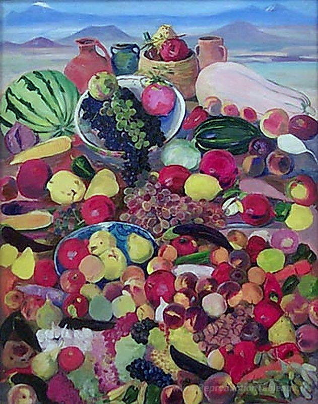 Nous vous proposons une reproduction artisanale sur toile du célèbre tableau 'Les fruits des pentes rocheuses d'Aragats' de Martiros Saryan, provenant du Musée de la Reproduction.