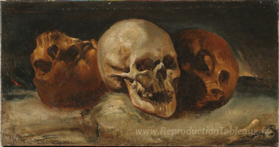 Nous vous proposons une reproduction artisanale sur toile du célèbre tableau 'Les trois crânes' de Theodore Gericault, provenant du Musée de la Reproduction.