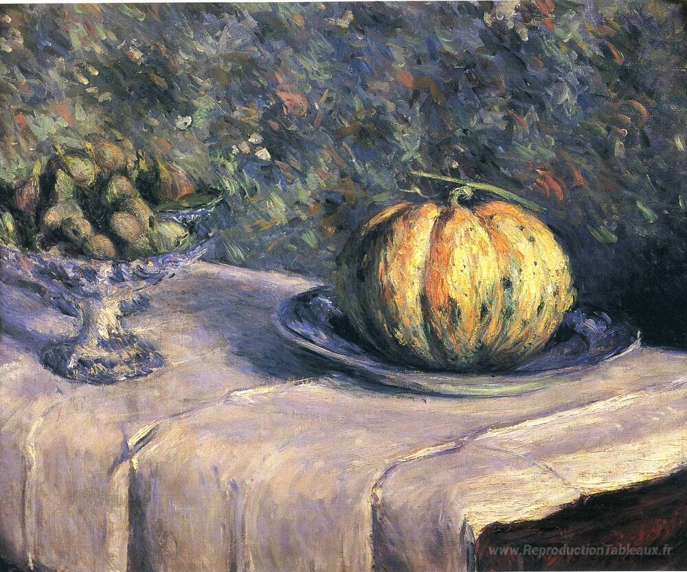 Nous vous proposons une reproduction artisanale sur toile du célèbre tableau 'Melon et bol de fruits avec les figues' de Gustave Caillebotte, provenant du Musée de la Reproduction.