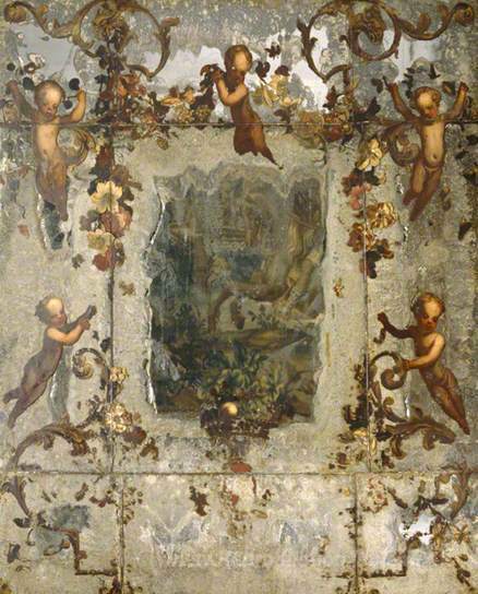 Nous vous proposons une reproduction artisanale sur toile du célèbre tableau 'Miroir décoré de putti, de fleurs et de rouleaux acanthus' de Mario Nuzzi, provenant du Musée de la Reproduction.