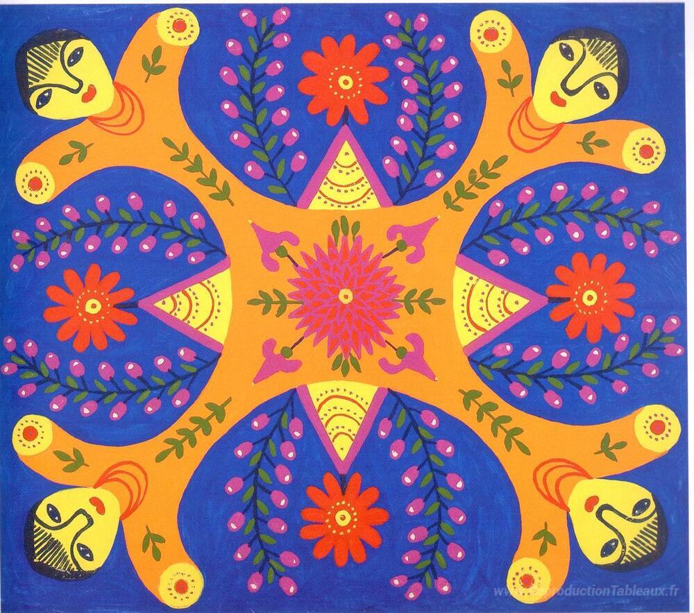Nous vous proposons une reproduction artisanale sur toile du célèbre tableau 'Nappe de table' de Maria Primachenko, provenant du Musée de la Reproduction.
