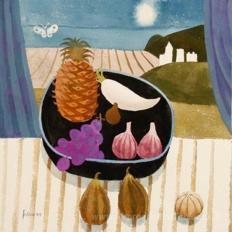 Découvrez l'univers enchanteur de Mary Fedden, une artiste britannique emblématique du XXe siècle, reconnue pour ses compositions vibrantes et son approche unique de la nature morte. Avec sa célèbre œuvre, Nature morte avec ananas et papillon, Fedden déploie un éventail de couleurs riches et de formes délicates, créant un tableau qui captivera tous les passionnés d'art. Son style distinctif, mêlant influence moderniste et tradition, offre une vision poétique du quotidien.