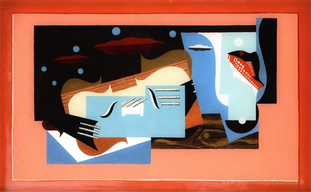Nous vous proposons une reproduction artisanale sur toile du célèbre tableau 'Nature morte avec Big Bear' de Louis Marcoussis, provenant du Musée de la Reproduction.