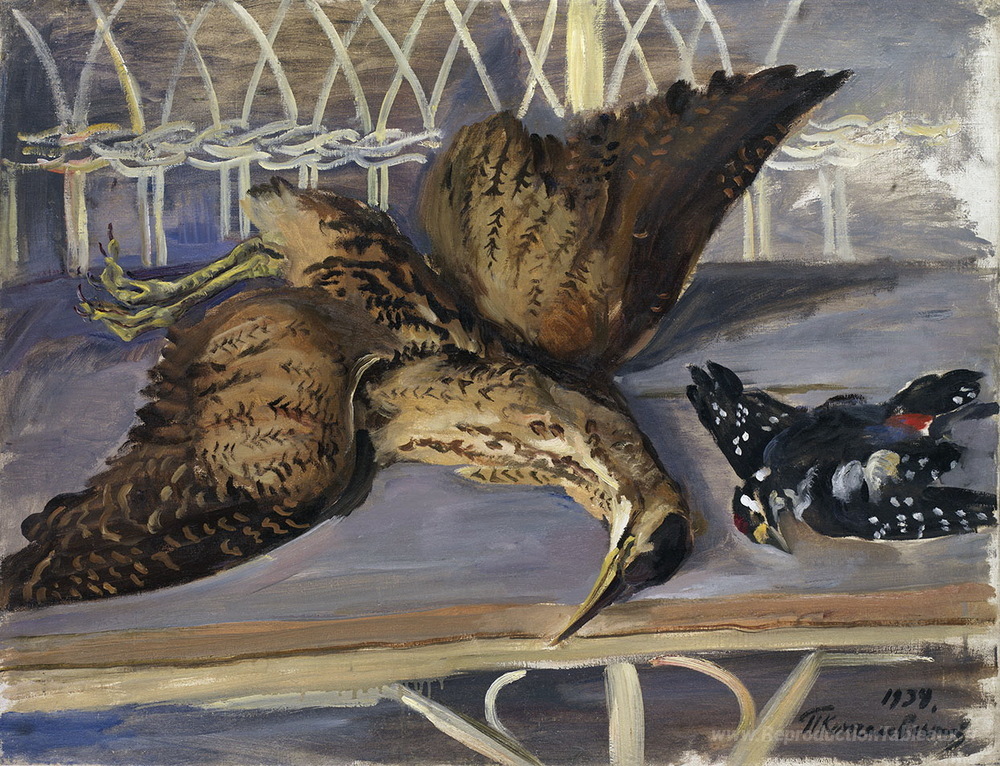 Nous vous proposons une reproduction artisanale sur toile du célèbre tableau 'Nature morte avec bittern et pic' de Pyotr Konchalovsky, provenant du Musée de la Reproduction.
