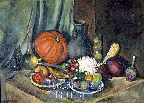 Nous vous proposons une reproduction artisanale sur toile du célèbre tableau 'Nature morte avec citrouille et un pichet' de Ilya Mashkov, provenant du Musée de la Reproduction.