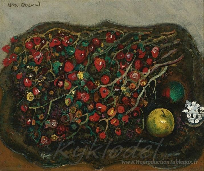 Nous vous proposons une reproduction artisanale sur toile du célèbre tableau 'Nature morte avec des baies et des pommes' de Boris Grigoriev, provenant du Musée de la Reproduction.