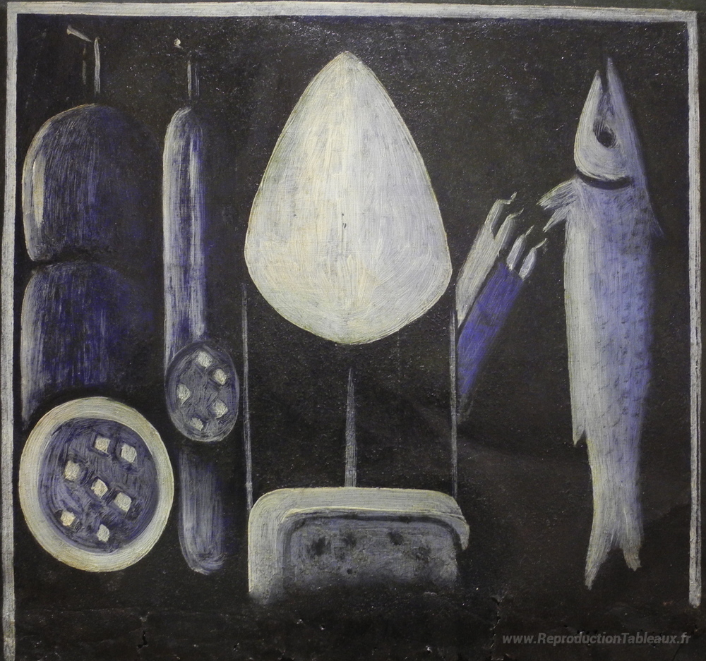 Nous vous proposons une reproduction artisanale sur toile du célèbre tableau 'Nature morte avec des bonbons de sucre (partie de la panneau à d' de Niko Pirosmani, provenant du Musée de la Reproduction.