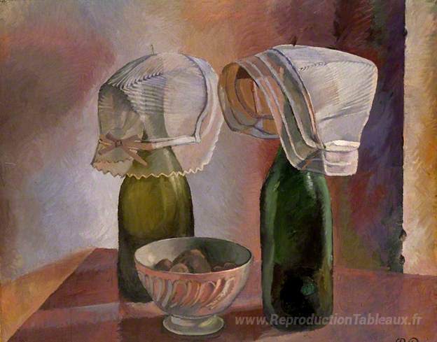 Nous vous proposons une reproduction artisanale sur toile du célèbre tableau 'Nature morte avec des bouteilles et des bonnets breton' de Pierre Roy, provenant du Musée de la Reproduction.