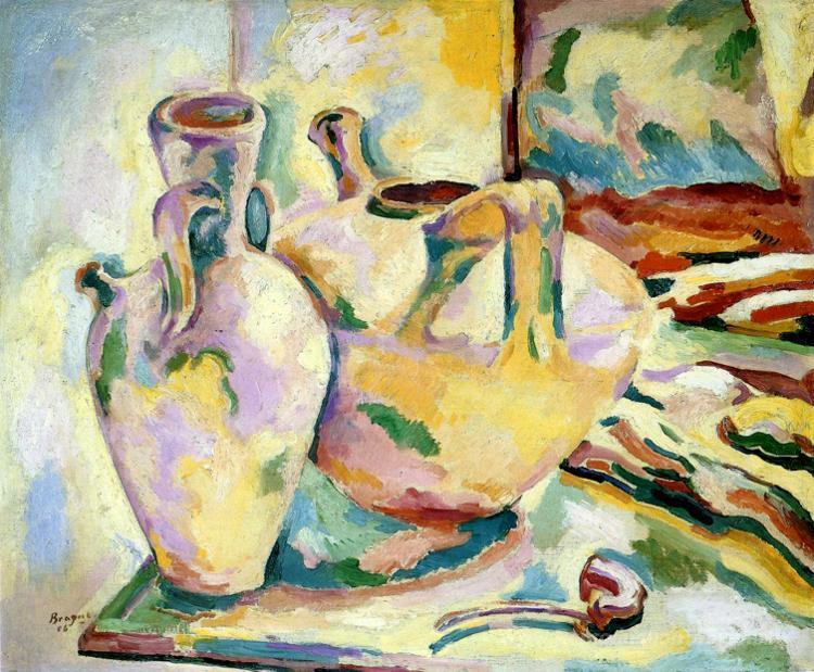Nous vous proposons une reproduction artisanale sur toile du célèbre tableau 'Nature morte avec des cruches et des piles' de Georges Braque, provenant du Musée de la Reproduction.