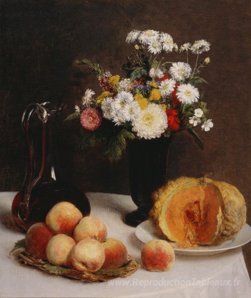 Nous vous proposons une reproduction artisanale sur toile du célèbre tableau 'Nature morte avec des fleurs et des fruits de carafe' de Henri Fantin-Latour, provenant du Musée de la Reproduction.