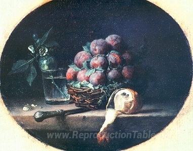 Nous vous proposons une reproduction artisanale sur toile du célèbre tableau 'Nature morte avec des prunes et un citron' de Anne Vallayer-Coster, provenant du Musée de la Reproduction.